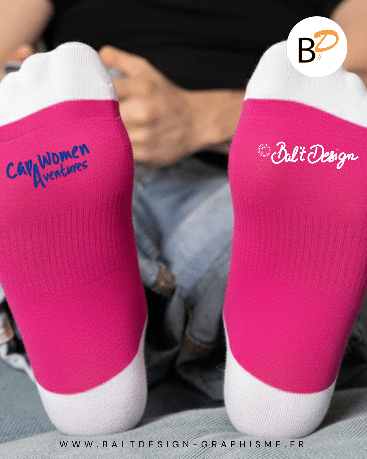 Je vous partage une réalisation qui va bien au-delà du simple « goodie » : la création de chaussettes pour l’association sportive Cap Women Organisation.